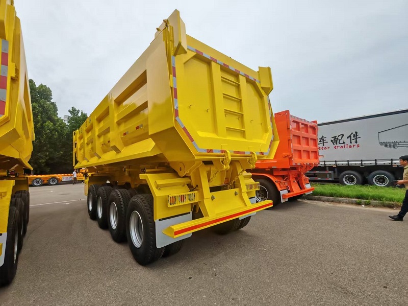 The 4 axles tipper trailer features a U-shaped design, making it ideal for transporting materials like clay, which are prone to slipping. The steel plate suspension ensures a very smooth ride on the road and maximizes stability during tipping. The trailer is equipped with shrouded lights on both sides for added safety. Integral fenders reduce the impact of soil splashing on the trailer, extending its service life. To prevent cargo from falling, a tarp can be added to the cargo box, both manual and electric tarps are available.
