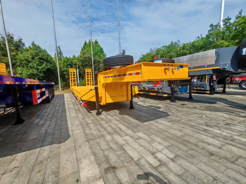 This lowbed semi-trailer uses Q355 high-strength steel and a 90# traction pin, with single-speed landing legs and one-touch hydraulic ramp, ideal for heavy machinery transport on rough terrain with high durability, load capacity and efficiency.
