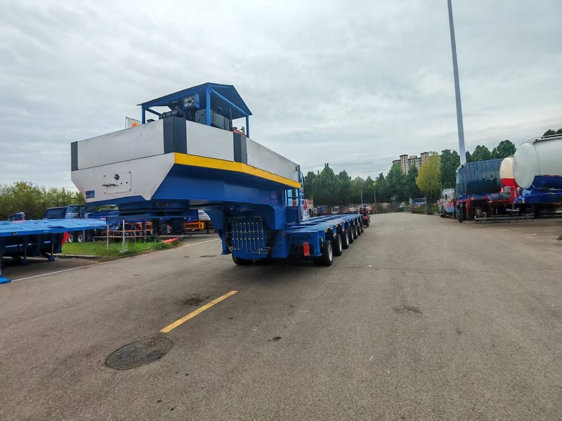 Drive steadily, avoid sharp turns and sudden stops, and check connections regularly. Upon arrival, disassemble the gooseneck again, unlock the cargo, and guide the machinery to drive off the platform safely.